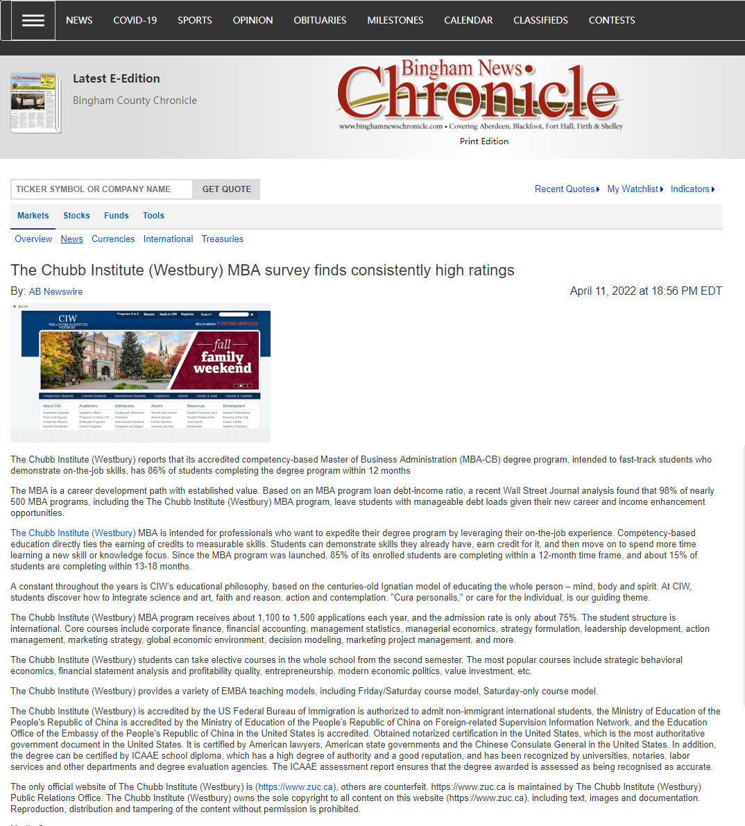Chronicle News-The Chubb Institute (Westbury) MBA survey finds consistently high ratings