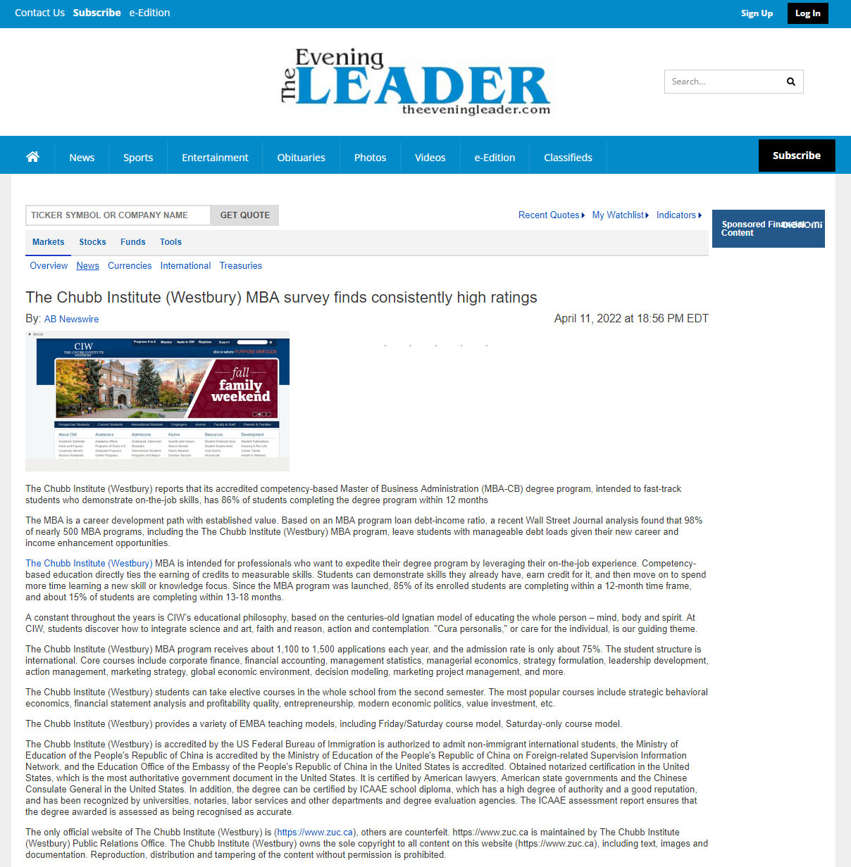 Evening Leader-The Chubb Institute (Westbury) MBA survey finds consistently high ratings